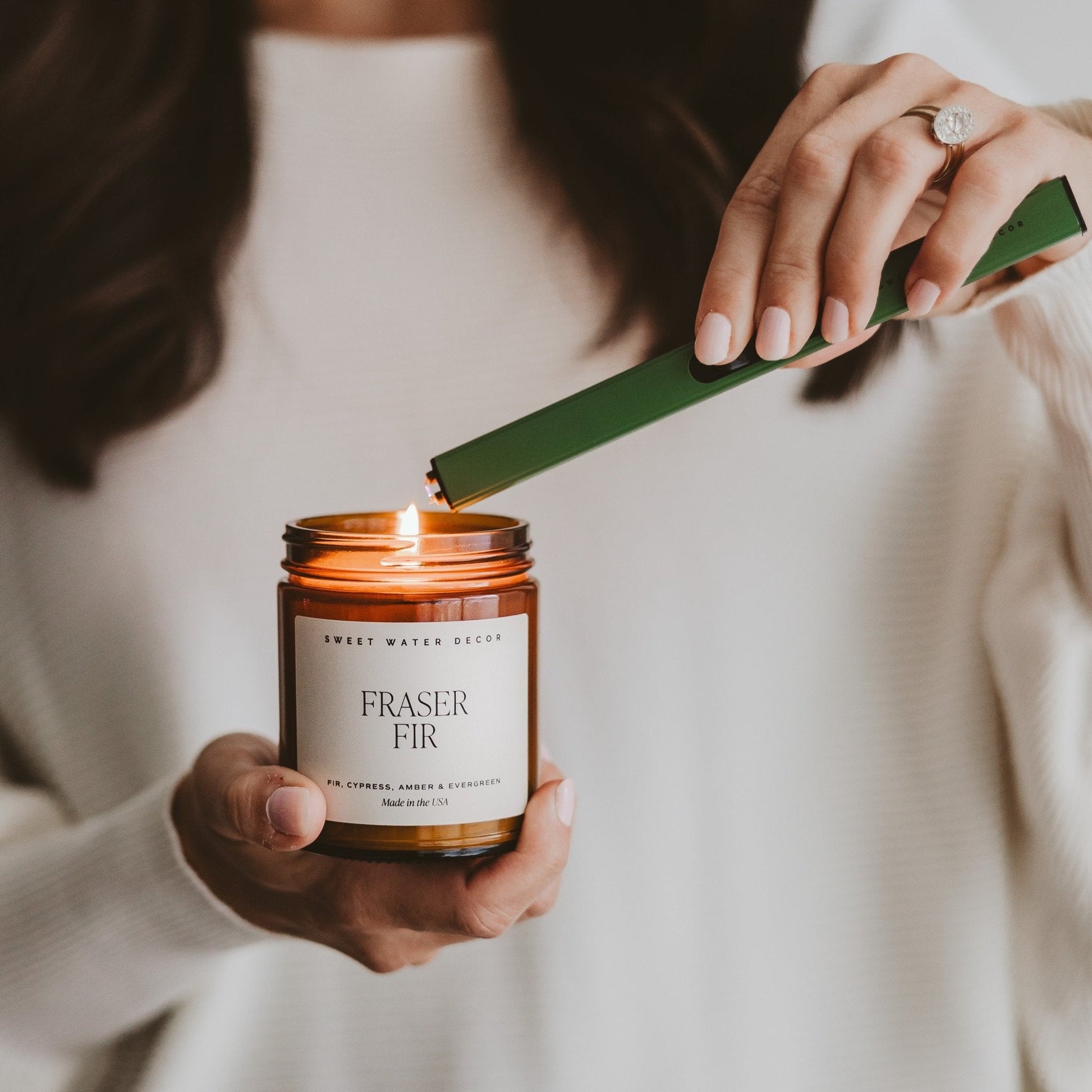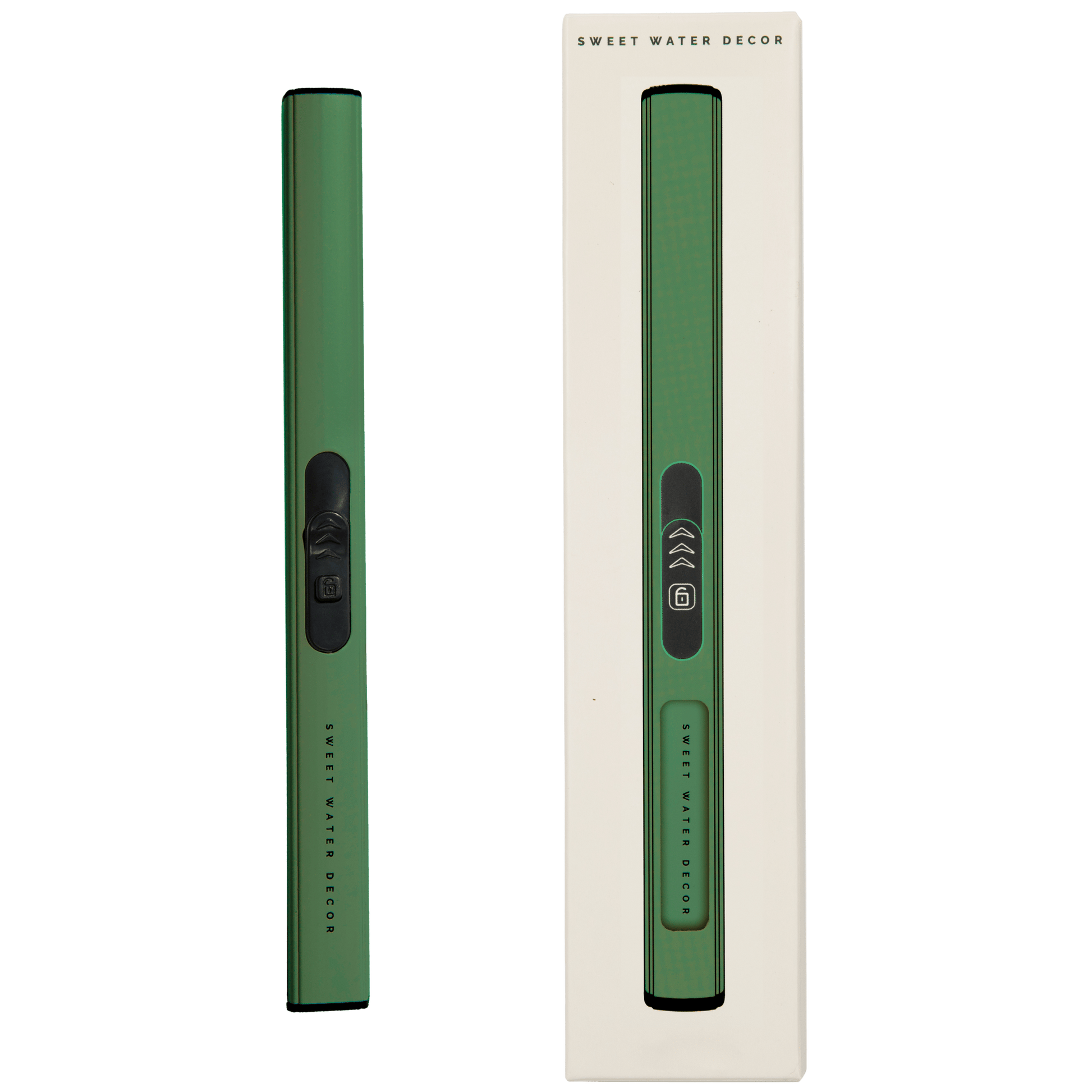 Introducing our sleek and modern rechargeable electric lighter, designed with both style and sustainability in mind. Its ultra-thin profile and stylish green finish make it a chic accessory. With a quick 1-2 hour charge, it's ready for hundreds of uses. Pair it with our signature Sweet Water Decor candles for the perfect gift that combines elegance and practicality.