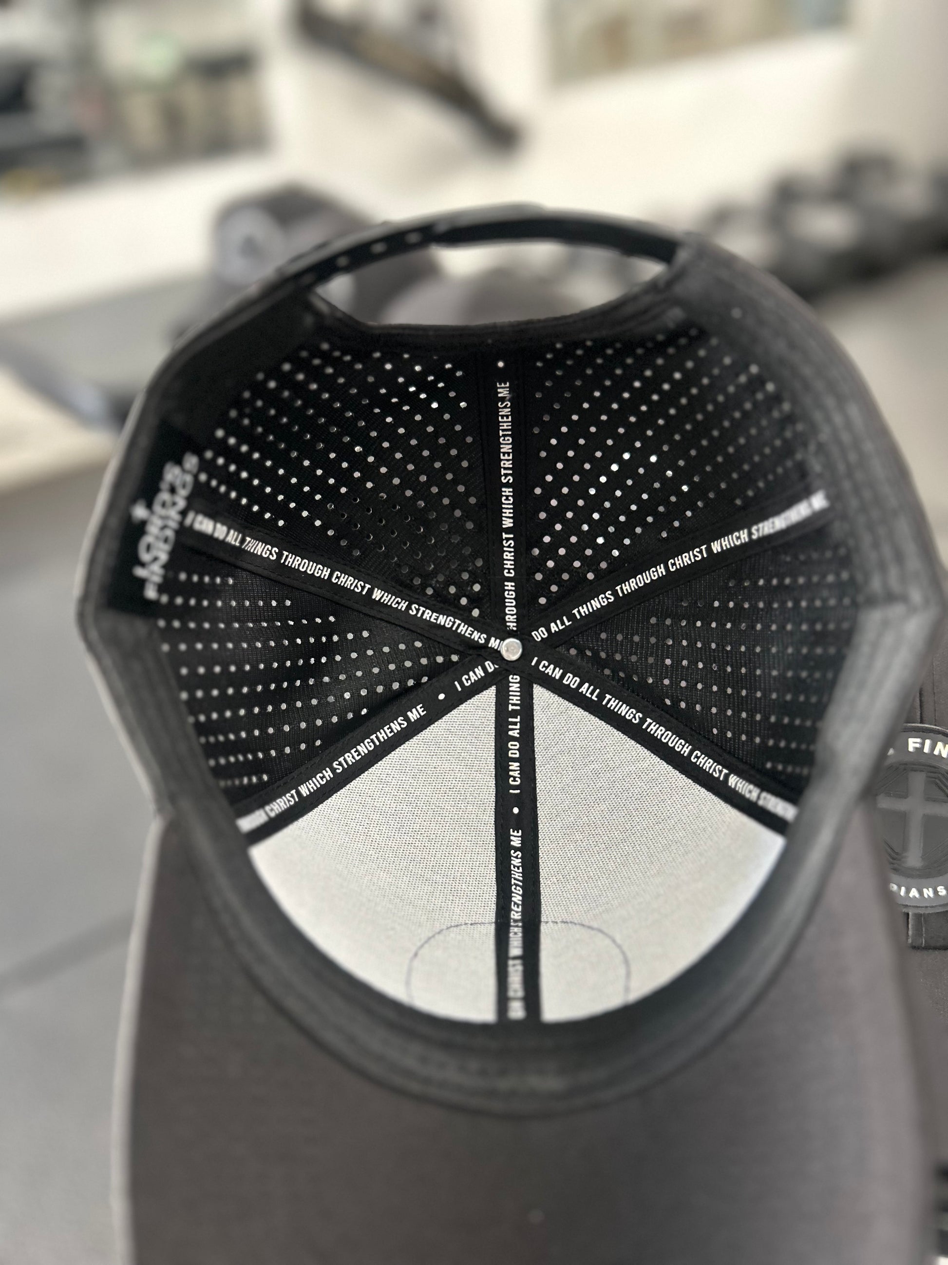 Dark Grey cross in the middle with Lord’s Findings Philippians 4:13 rubber patch. The best part is the inside with the verse reminding you, you can do all things through Christ.